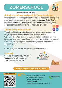 Ontdek wereldbouwwerken bij de Talent Academie! Deze zomervakantie organiseert de Talent Academie een speelsen energiek programma voor kinderen uit groep 3 t/m 8. We combineren taal en rekenen met creatieve workshops gericht op persoonlijke ontwikkeling en heel veel plezier.